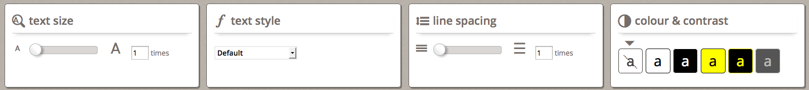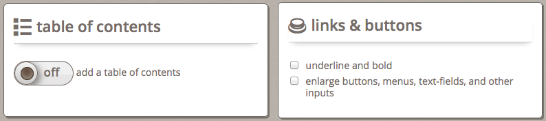 - Visibility and operability of the interface: the same contrast options for adjusting text also apply to interface elements (e.g., buttons, drop-downs, etc.); interface elements and links can also be made larger for emphasis and easier clicking